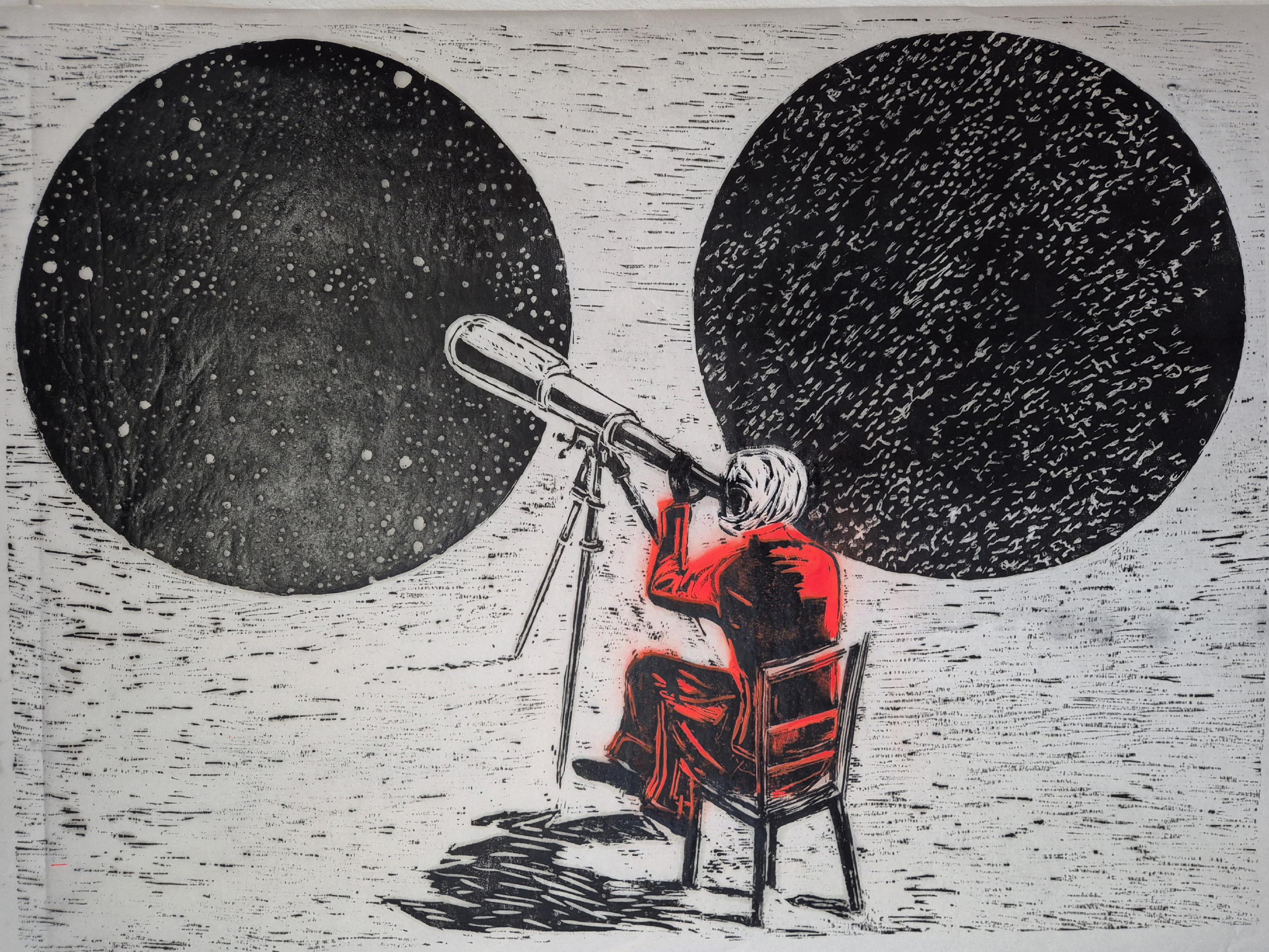 Im Zentrum steht ein großformatiger Holzschnitt auf chinesischem Reispapier. Eine androgyne Figur im orangefarbenen Overall blickt durch ein Teleskop – zugleich in den Kosmos und auf mikroskopische Zellstrukturen. Die Gegenüberstellung von Makro- und Mikrokosmos bildet den konzeptuellen Rahmen der Arbeit.